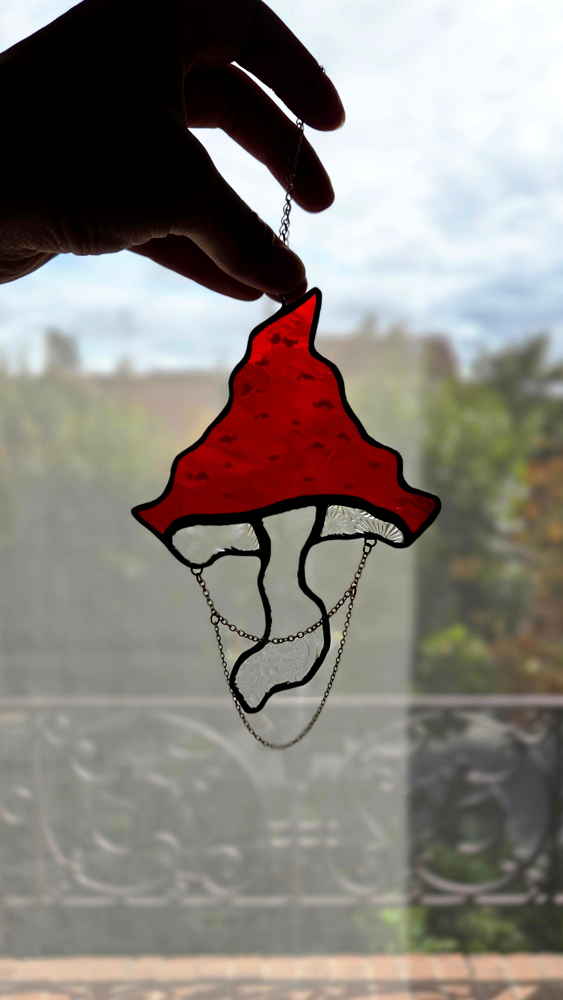 Un chapeau rouge transparent orné de taches blanches peintes à la main, avec une tige texturée et florale. Une décoration unique qui capte la lumière et apporte une touche féerique à votre intérieur.