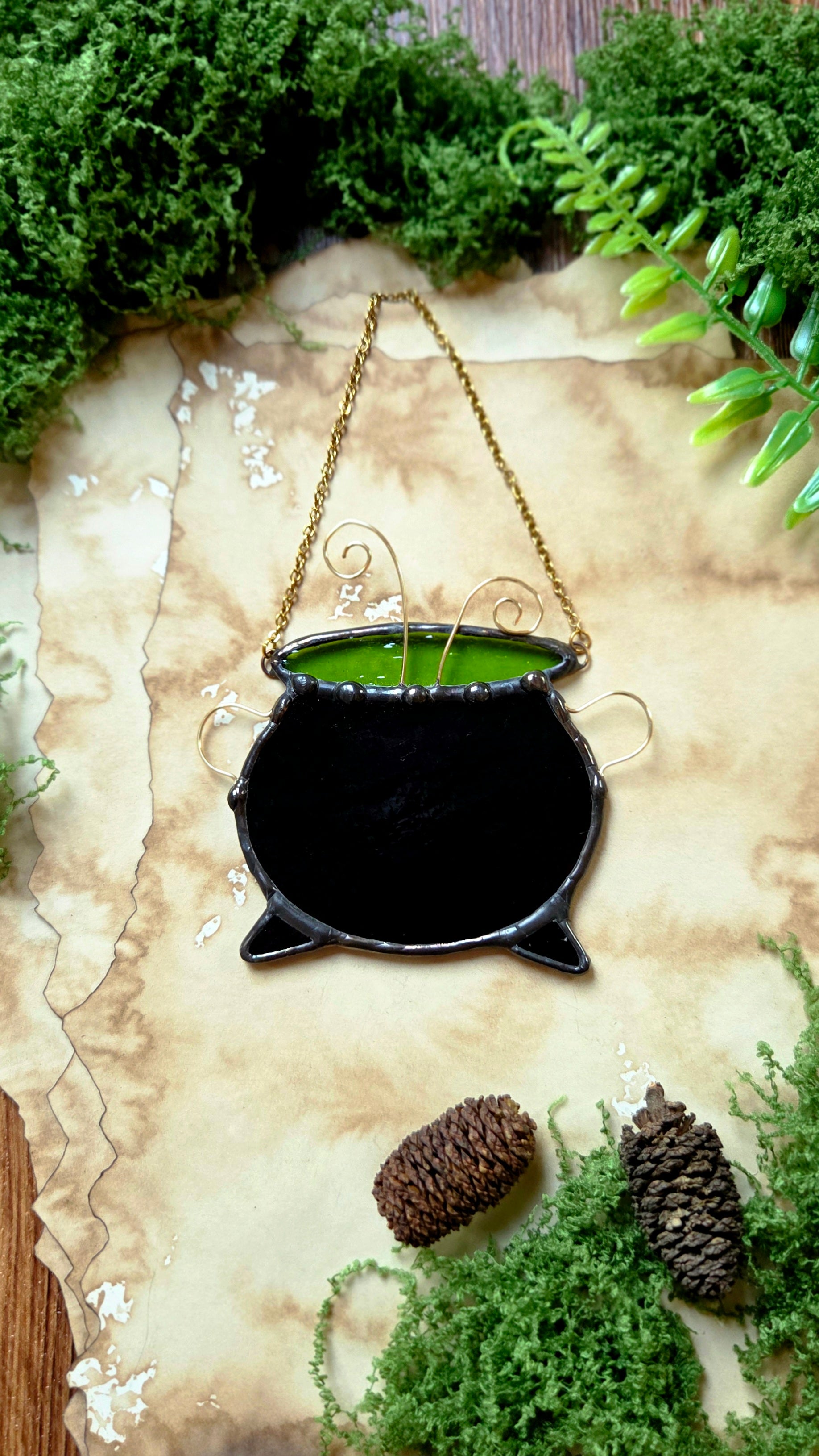 Un chaudron en vitrail unique, réalisé en verre noir et vert texturé pour un effet mystérieux et magique.