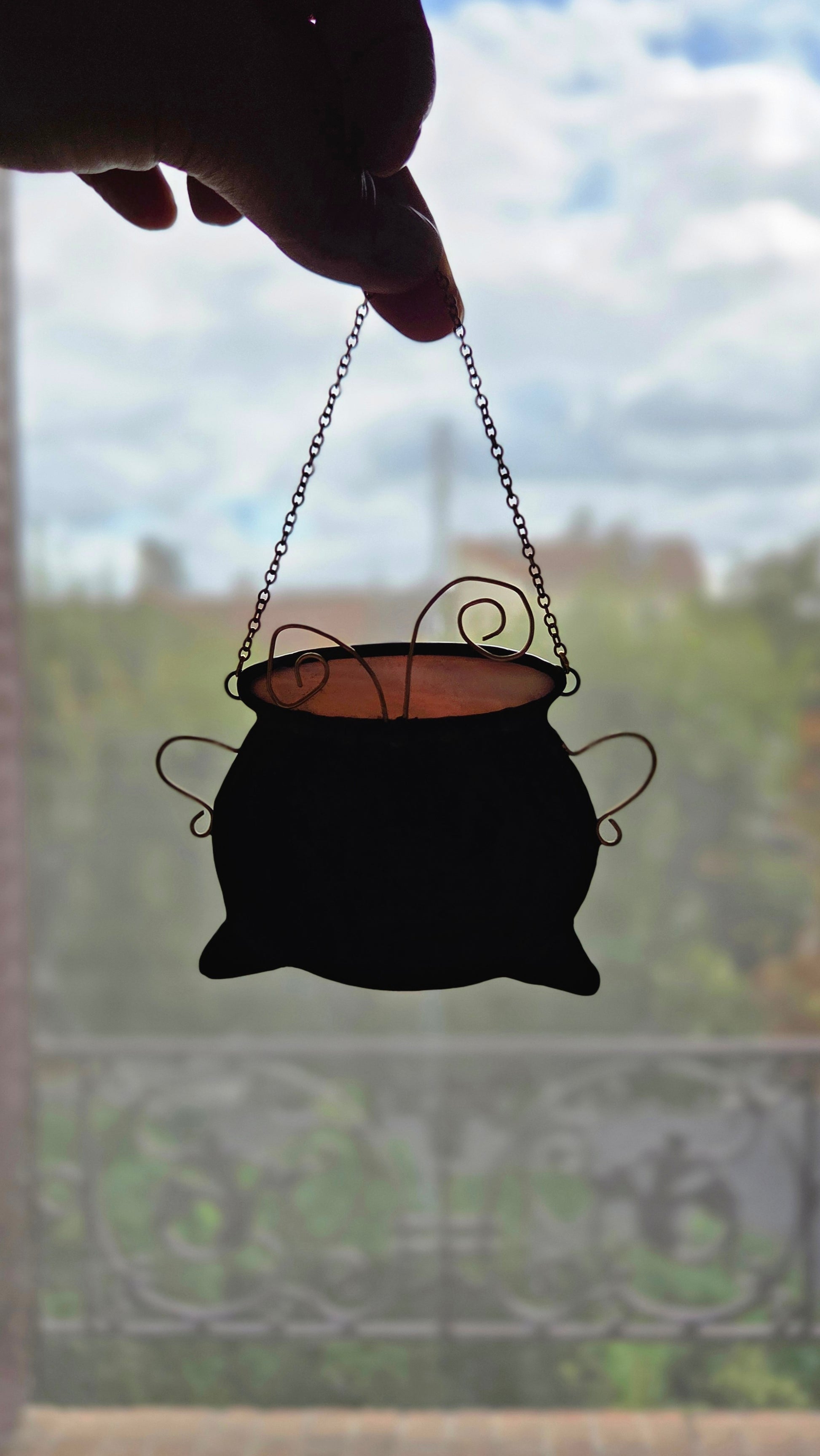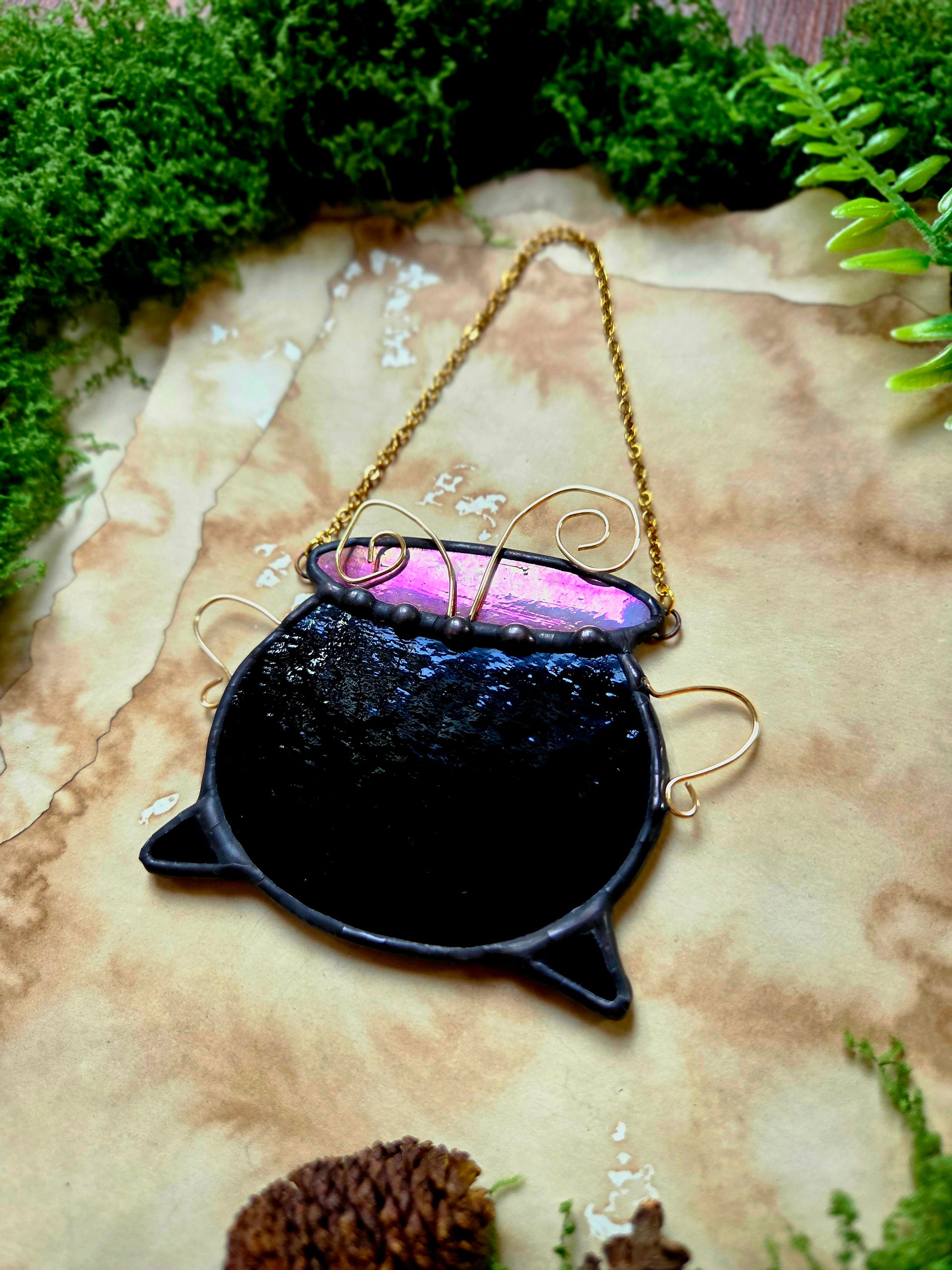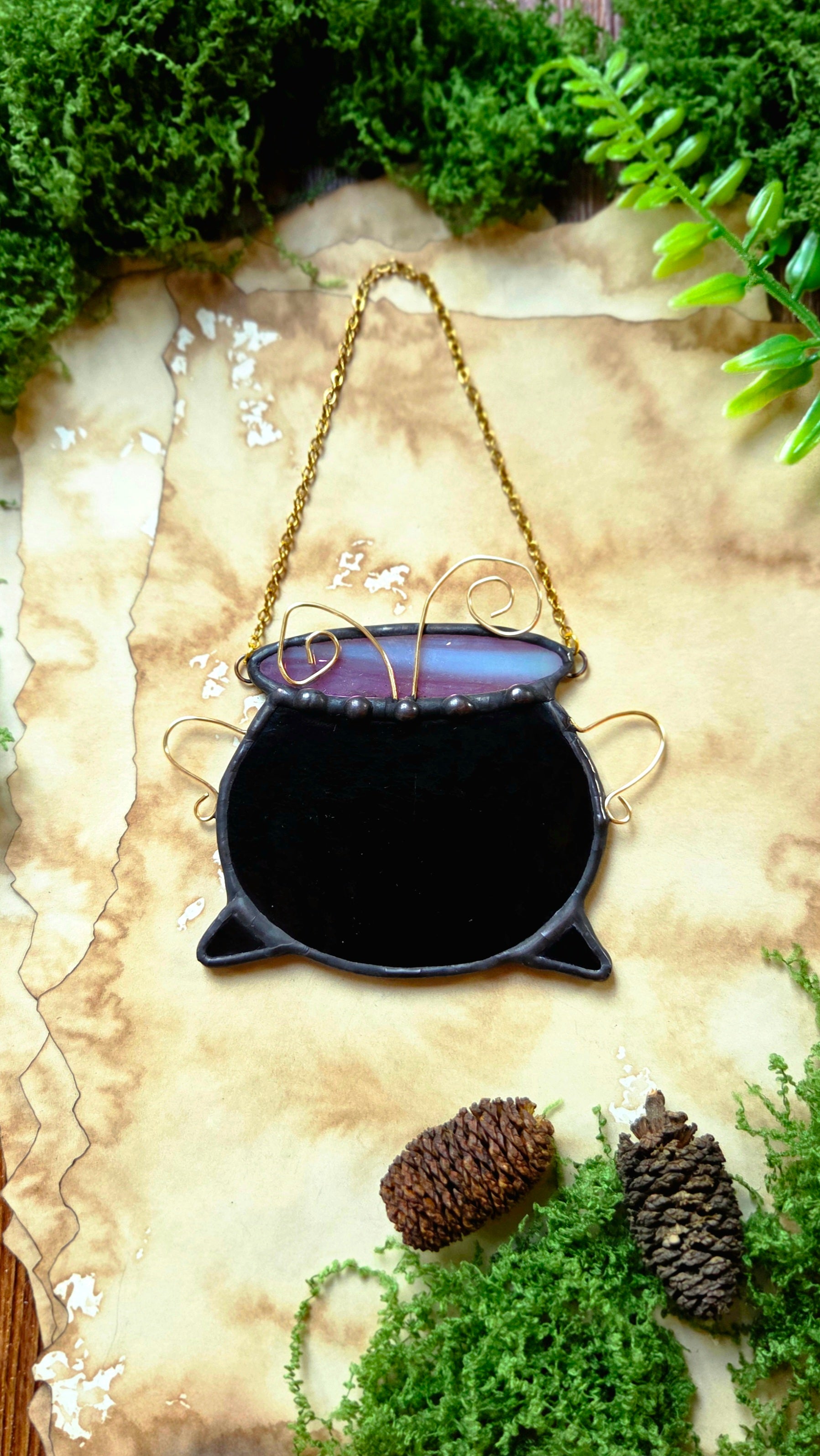 Un chaudron en vitrail unique, réalisé en verre noir et violet irisé pour un effet mystérieux et magique.