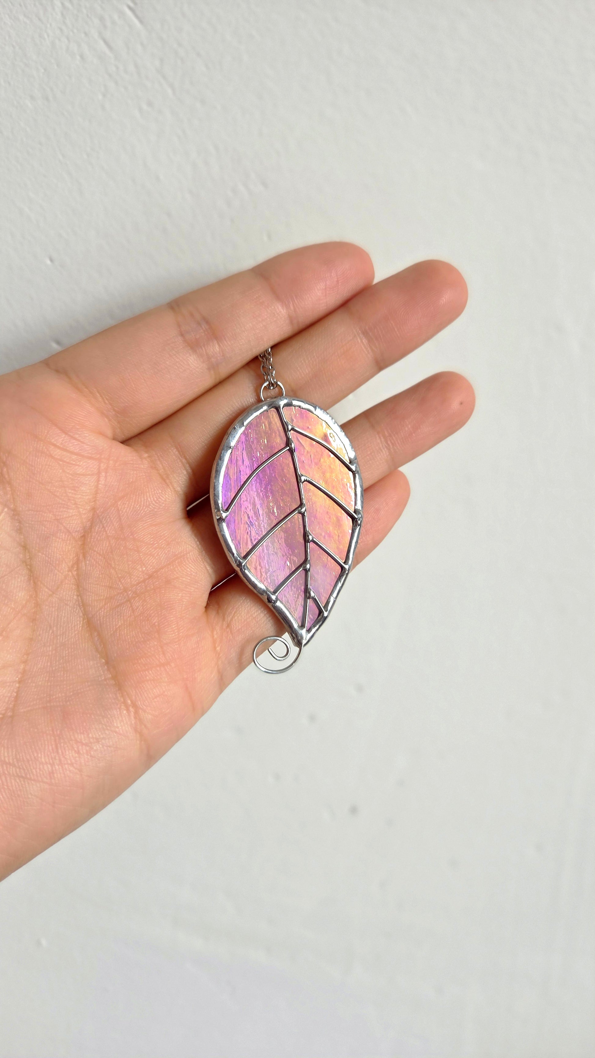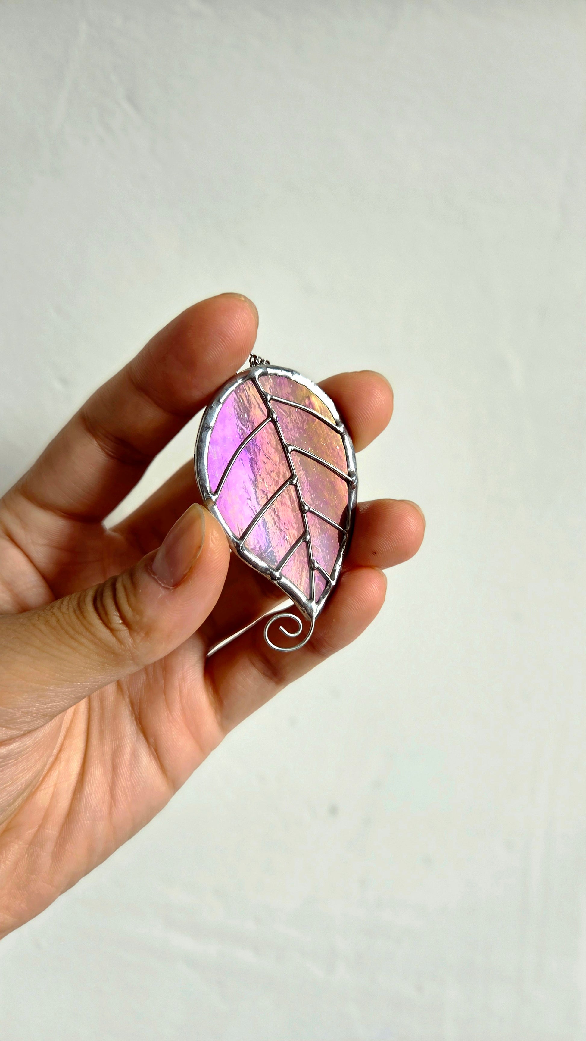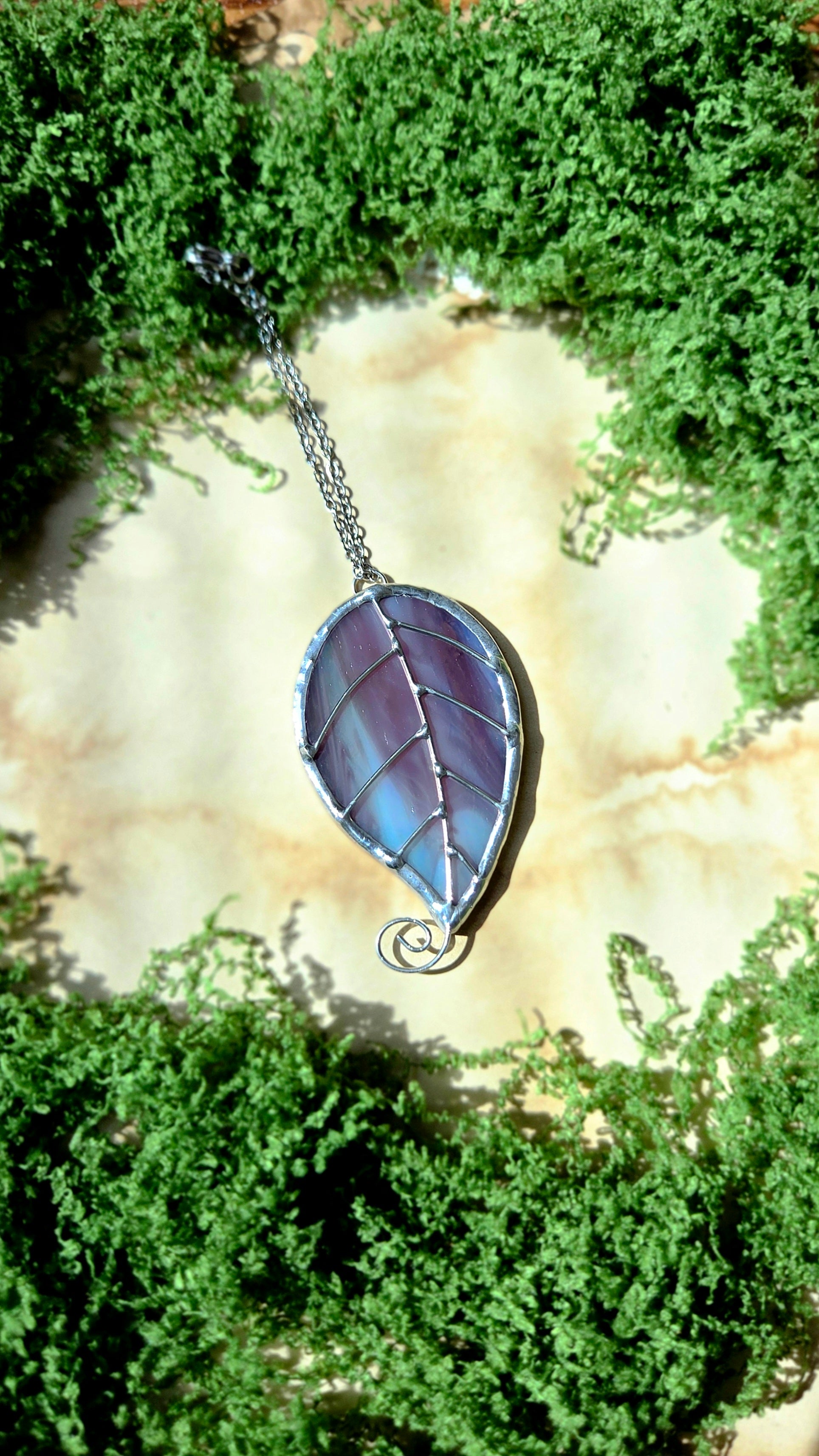 Une petite feuille d’automne en vitrail, d’un violet aux reflets irisés qui changent avec la lumière. Chaque mouvement du soleil révèle de nouvelles nuances.