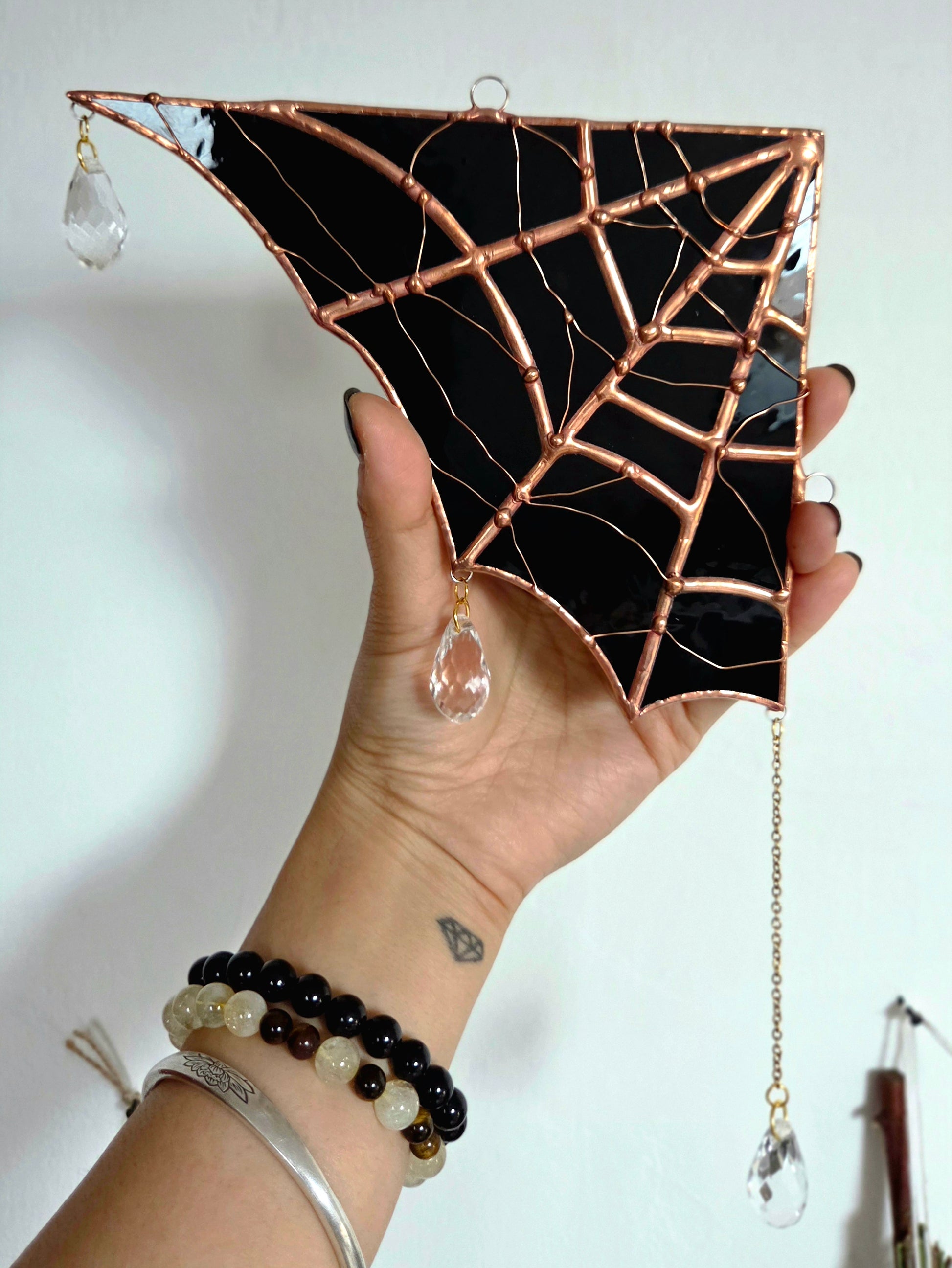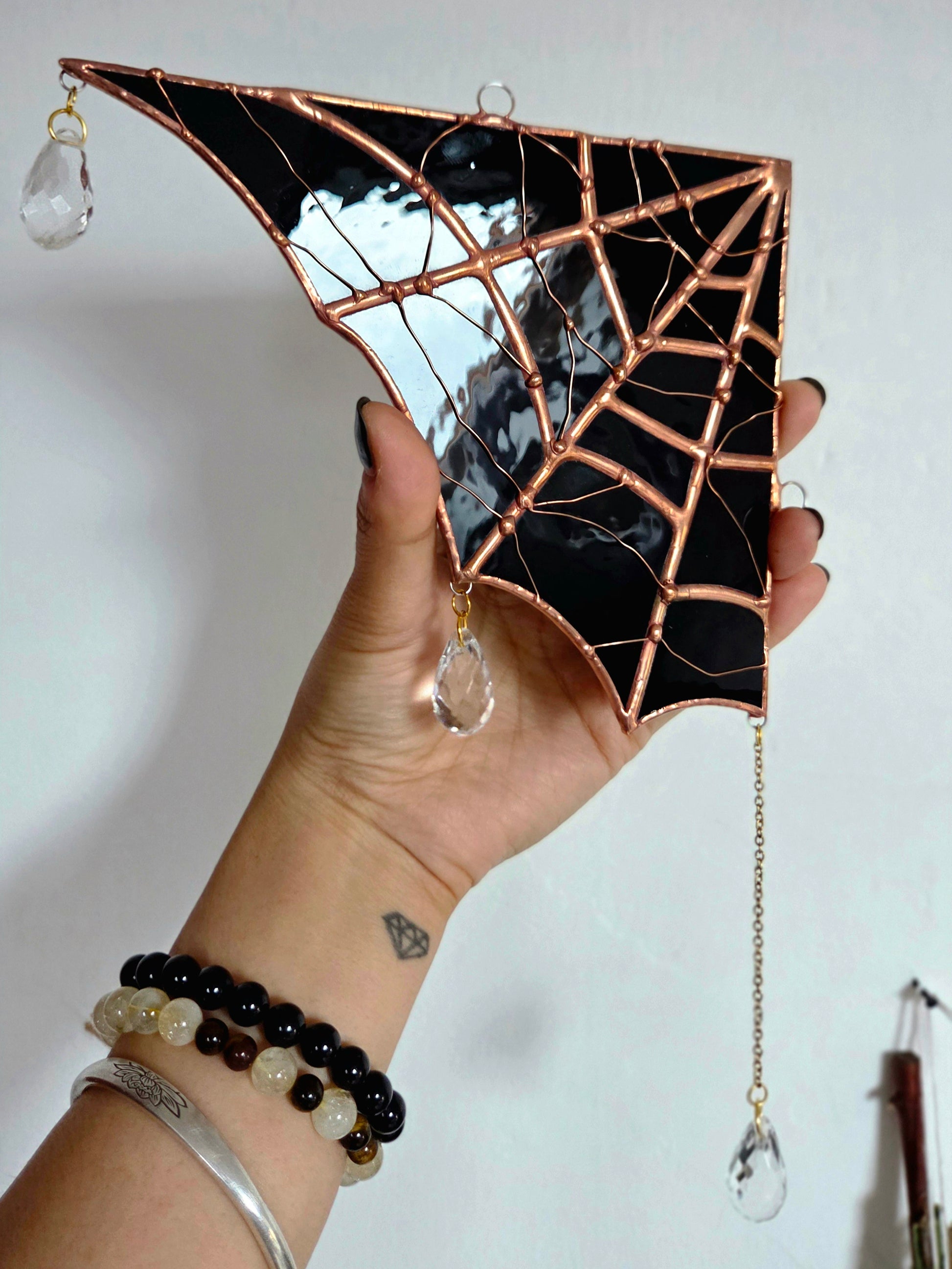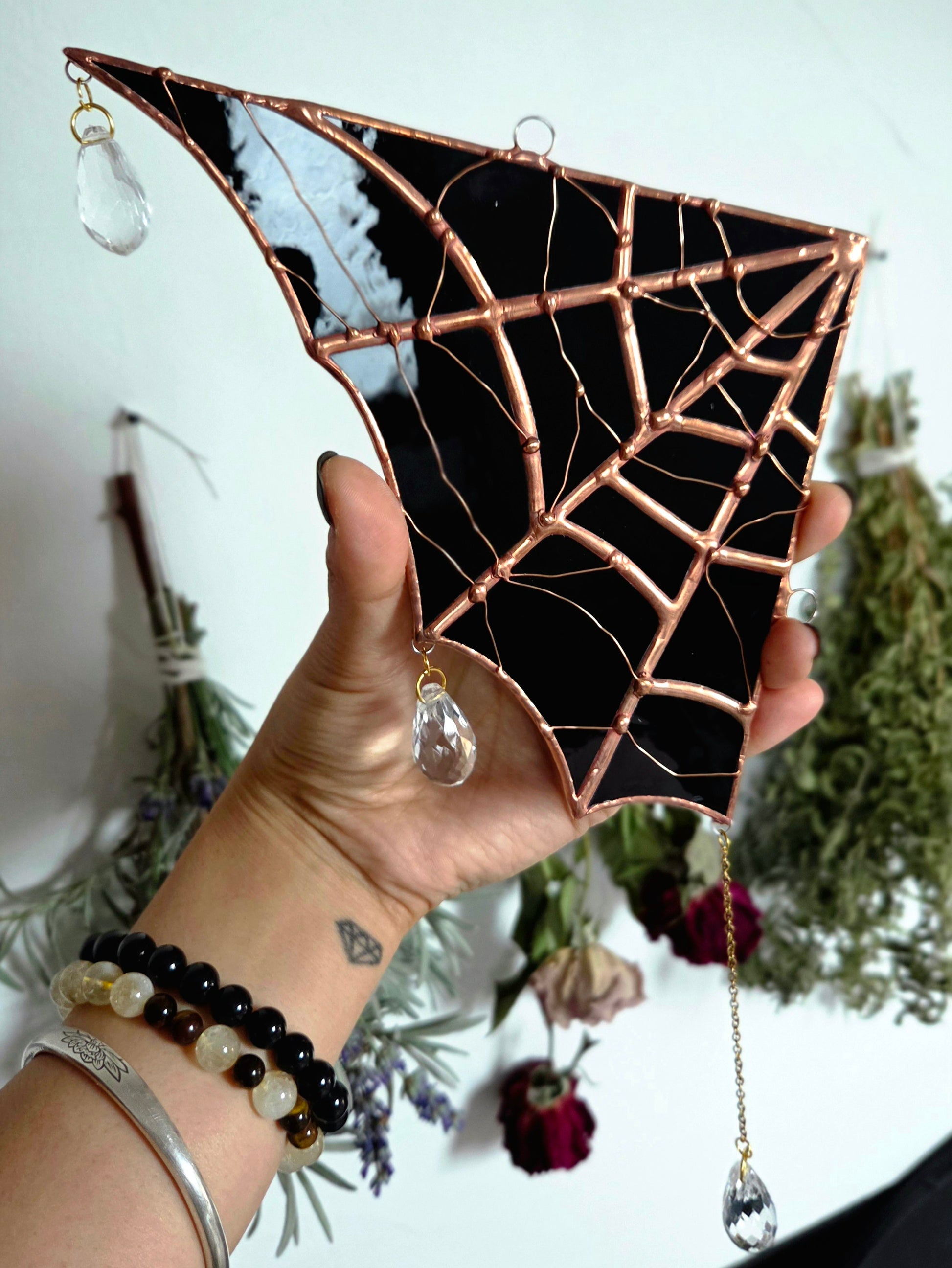 Une petite toile d’araignée pleine de charme, faite en verre noir opaque avec une finition cuivrée.